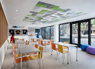 Upon entering HSA, visitors will immediately check in at the newly positioned security desk before gaining access to the main gallery and other parts of the building. A series of decorative murals, installed on the walls in the main lobby, visualize the mission and promise of HSA and charts the history of the organization and its founder Dorothy Maynor. The HSA Store shares space with the Cafe, a vibrant, sun-drenched waiting area for parents, students, and visitors. The back-garden courtyard has been revamped. Improvements include installing a new uplighting system that provides dramatic night time effects, as the light reflects against the natural rock wall, and the building’s signature built-in waterfall becomes visible from the street.