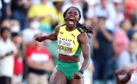 EUGENE, Oregon– Jamaican Shericka Jackson flirted with Flo Jo’s 34-year-old world record as she unleashed a stunning effort here late Thursday to dominate the 200 meters final and win her first-ever World title.