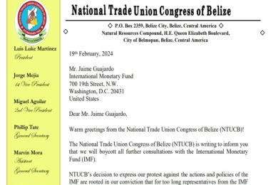 In its letter, which was copied to the International Labour Organization (ILO), the Central Bank of Belize, and the Caribbean Congress of Labour, the umbrella union body is calling on the IMF to reconsider its approach to economic assistance and to prioritize the needs and rights of the people in debtor nations.