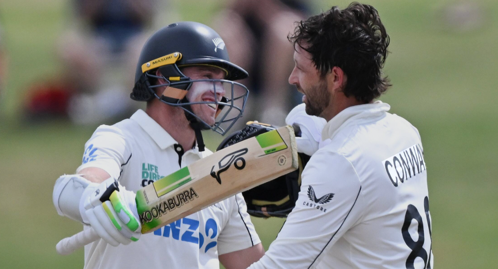 Latham – who made 137 in the first innings – smashed 101 off 130 balls, while Conway followed up his first innings double hundred with an even 100 off 139 balls, to become the first pair of openers to score twin tons in the same game in all first-class cricket.