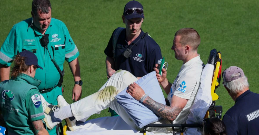 He was the Kiwis’ best bowler in the first innings, finishing with figures of 4-32 from his 16 overs, but had to be stretched off in obvious discomfort after taking a tumble while trying to stop a boundary at fine leg.