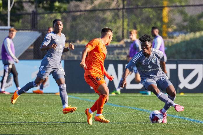 MNUFC2 player Leo Conneh (61) dribbles the ball while Houston Dynamo 2 midfielder Jathan Juarez (13) defends during the MNUFC2 v Houston Dynamo 2 match on Sunday, June 11, 2023 at National Sports Center in Blaine, Minnesota. (Photo by Michael Lake / Lake Photography)