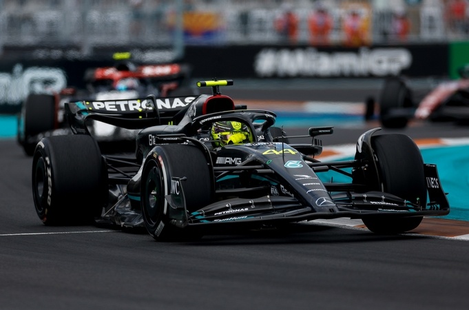 The British race car driver with Grenadian heritage initially struggled for pace on the hard tire in the opening stint in the Mercedes W15 before he engaged in a fierce fight with the Haas driver Nico Hulkenberg of Germany across several laps at the Miami International Autodrome.