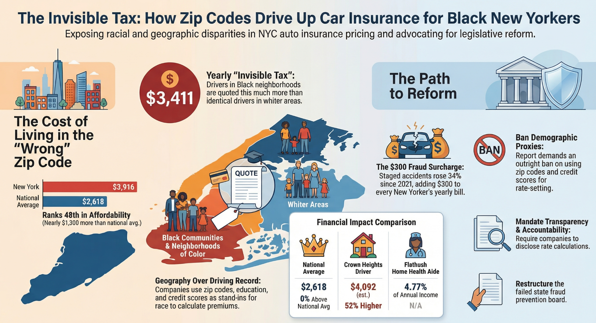 The Black Institute’s report calls on state and city lawmakers to act this legislative session to close the loopholes that make fraud profitable, ban the race-adjacent pricing practices that punish Black and immigrant neighborhoods, and build an insurance system that measures risk by how people drive, not by who they are or where they come from.