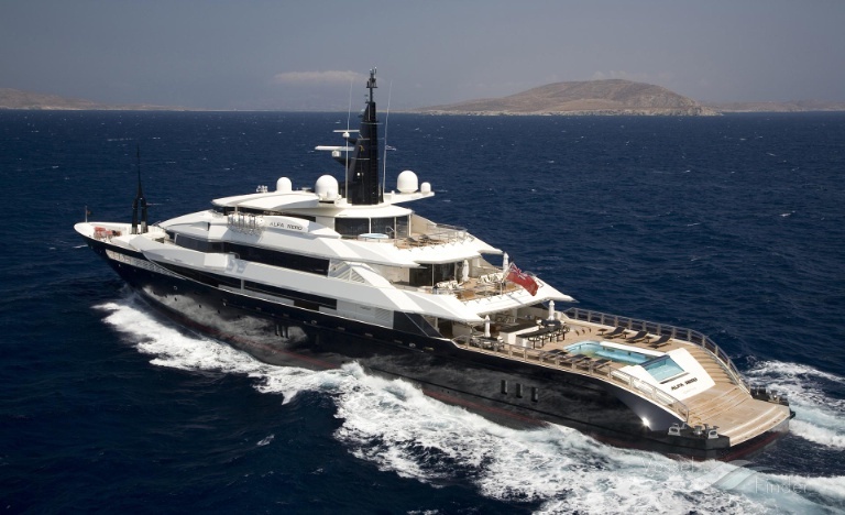 The yacht features a 12-meter infinity pool, a Jacuzzi, a spa, a beauty room, and a helipad.