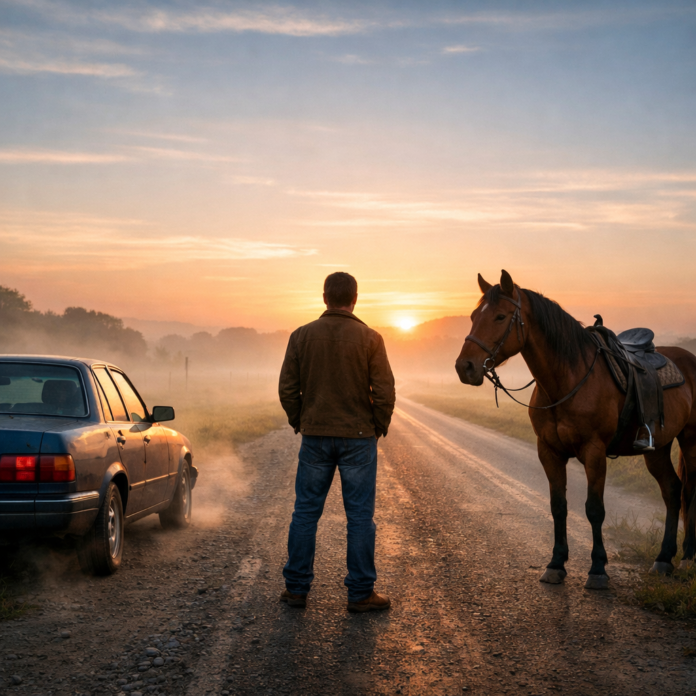 The man stood at the edge of the road just before dawn, mist curling around his shoes like a question he wasn’t ready to answer. To his left was an old car, paint faded, engine ticking softly as if it were thinking. To his right, a horse grazed calmly, breath rising in small clouds. All three had arrived at the same place, yet for very different reasons.